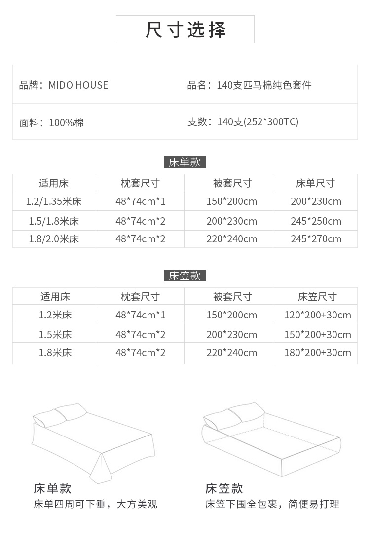 / MIDO HOUSE140支美国匹马棉高端床单床笠纯色全棉床品四件套